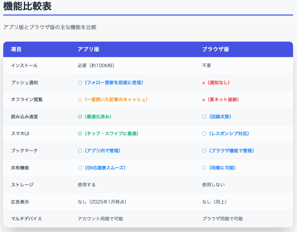 アプリストアでの更新作業を面倒に感じる方や、常に安定した環境で記事を読みたい方にとって、ブラウザ版の安定性は魅力的でしょう。技術的なトラブルのリスクを最小化したい場合、ブラウザという選択肢は合理的です。